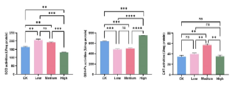 一是氧化應激損傷。暴露于500Hz連續噪聲導致大黃魚體內活性氧(ROS)過量累積;超氧化物歧化酶(SOD)活性在低噪聲組最高,高噪聲組顯著下降;谷胱甘肽過氧化物酶(GSH-Px)活性先降后升,高噪聲組達到峰值;過氧化氫酶(CAT)活性在中噪聲組最高,高噪聲組與對照組相近。噪聲暴露破壞機體抗氧化酶系統正常功能,高強度噪聲可能超越其抗氧化防御能力。