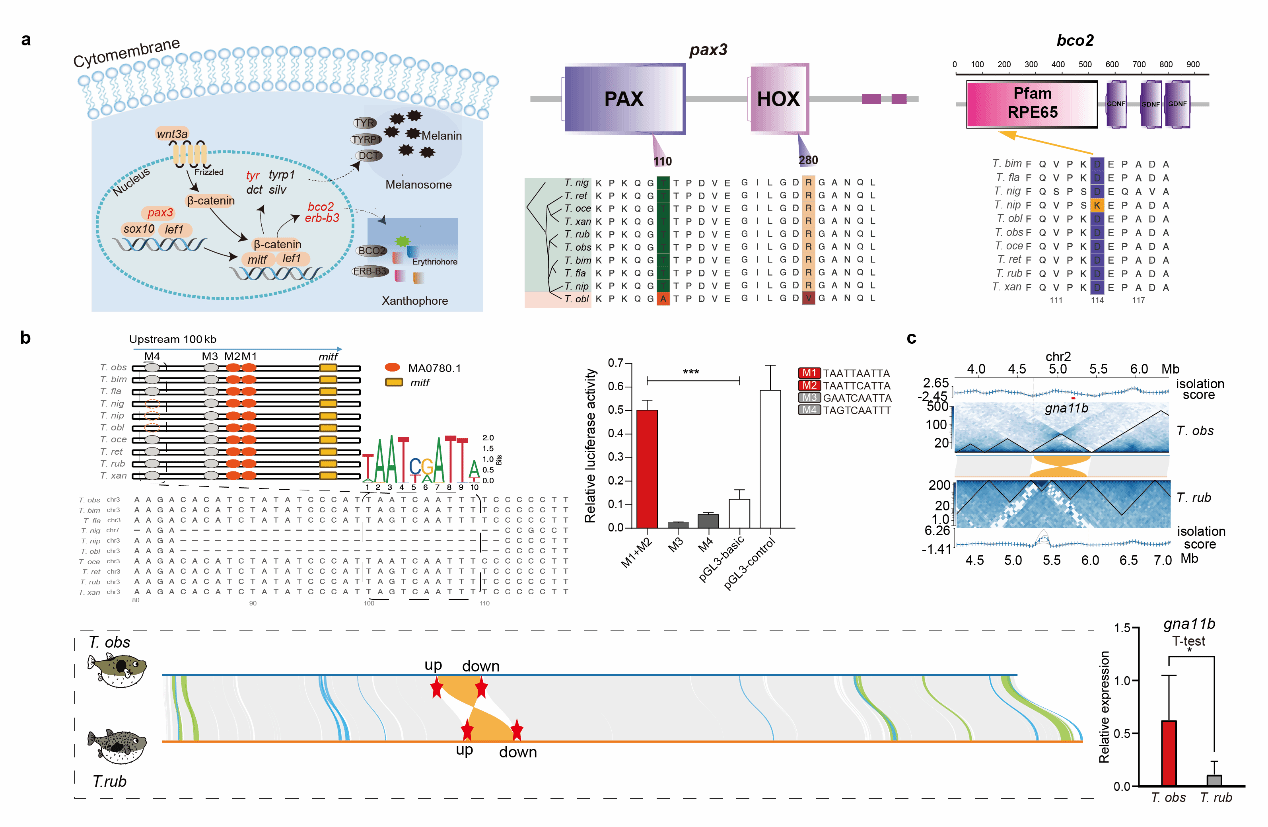 基于網狀演化歷史的動態框架,研究深入剖析了驅動河鲀物種分化的具體分子機制,特別是體色作為適應性輻射中的關鍵表型。體色常作為物種識別信號,直接驅動生殖隔離。在此背景下,研究發現,暗紋東方鲀基因組分化區域內的色素通路基因pax3和tyr受到強烈正選擇,pax3的物種特異結合位點顯著影響mitf轉錄活性,從而通過mitf調控tyr等黑色素合成關鍵酶的表達,進而調控黑色素在皮膚中的空間分布。結構變異分析顯示,暗紋東方鲀與紅鰭東方鲀2號染色體上存在一處745kb倒位變異,該倒位重組染色質三維構象,破壞色素分布基因gna11b鄰近的增強子—啟動子互作,導致gna11b表達上調,促進黑素細胞增殖及色素覆蓋度提升。此外,星點東方鲀的類胡蘿卜素代謝基因bco2及黃鰭東方鲀的受體酪氨酸激酶基因erb-b3呈現物種特異正選擇,提示膚色斑紋多樣化由多基因平行趨異驅動。點突變與結構變異協同重塑色素沉著網絡,構成河鲀表型快速演化的分子基礎,這一發現將基因組基礎、演化過程與表型創新有機整合,凸顯了多層次機制在物種形成中的協同作用。
