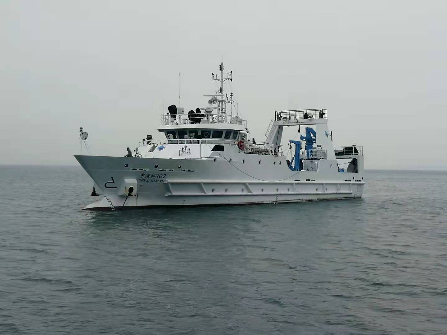 “中漁科102”號是農業農村部300噸級漁業資源調查船建設項目的重要組成部分,該船總長42.8米,總噸位398,主機功率634千瓦,定員30人,續航力4000海里,自持力30天的漁業資源調查船。